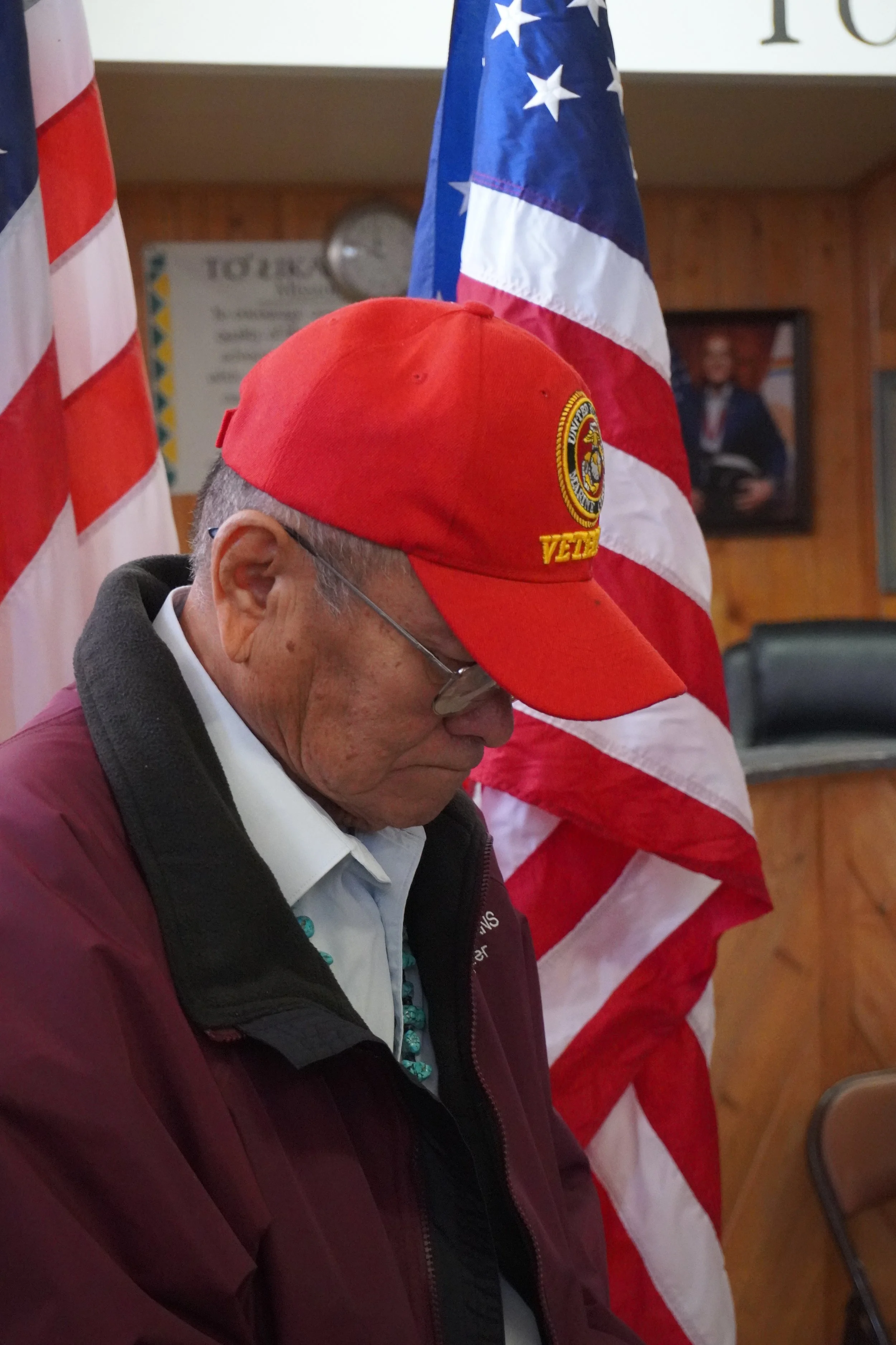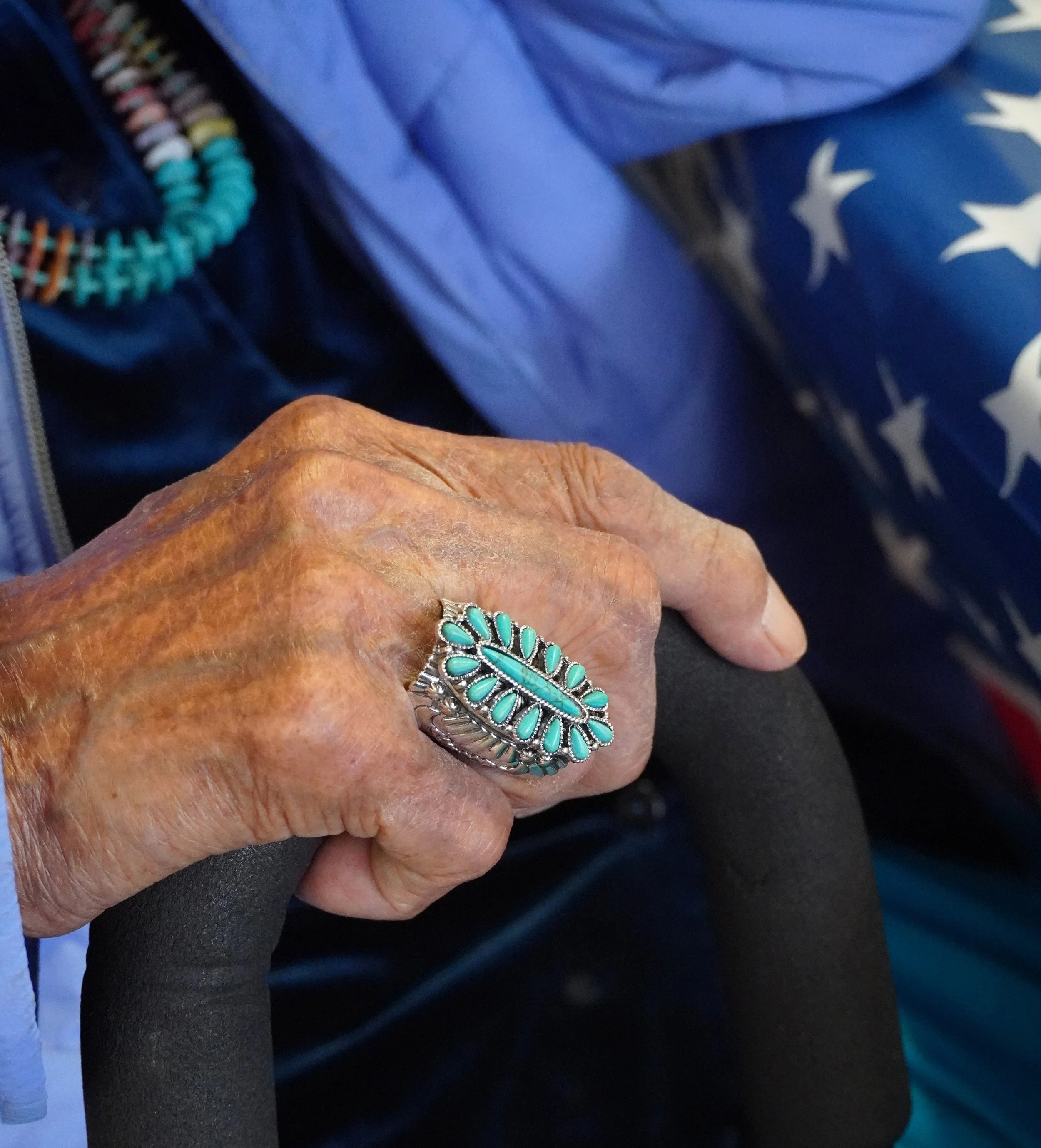 A weathered hand, a sacred stone, and the stars of a nation. This image captures the deep, enduring connection between Native American heritage and patriotic service. The turquoise ring—a symbol of protection and strength—stands beside the flag, reminding us that the spirit of freedom has been guarded by many generations of Indigenous warriors.